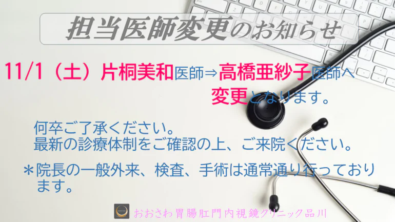 ◆担当医変更のお知らせ◆ 11/1(土)の片桐美和医師の検査・診察は、高橋亜紗子医師へ変更となります。何卒ご了承ください。最新の診療体制をご確認の上、ご来院ください。