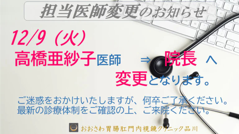 ◆担当医変更のお知らせ◆ 12/9(火)高橋亜紗子医師は休診となります。代わりに院長が担当いたします。何卒よろしくお願い申し上げます。